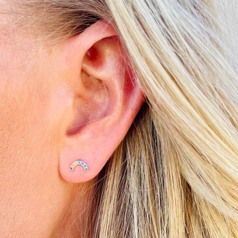 These are our beautiful & unique dainty rainbow earrings. We offer these in sterling silver, gold, and rose gold, and each one has 6 different color studs on them. Each one is about 4 mm tall, 7 mm wide, and 1 mm thick. This will make such a great unique addition to your earring collection! They are dainty & simple,...