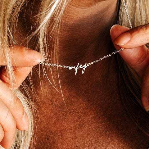 Flaunt your wifey status loud & proud with this beautiful & dainty wifey cutout necklace! ♥ This tiny, customizable necklace is perfect for everyday wear. It also makes a great gift for a bride to be, or any wife! We offer this dainty wifey necklace in sterling silver, 14kt gold plated on sterling silver, and 14kt rose gold plated on...