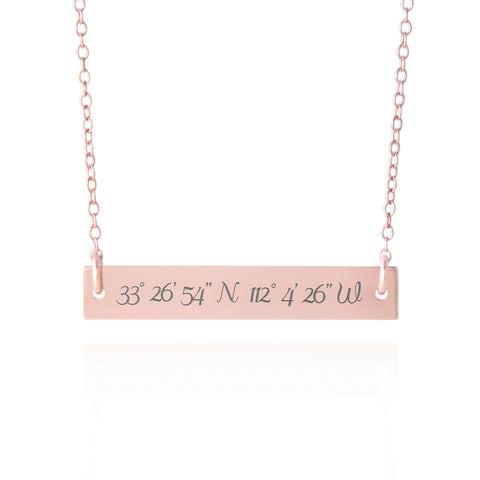 Here, you see our premium custom bar coordinates necklace. It hangs on an 18" chain, though you do have the option to request a custom chain length. You can also choose whether you want a sterling silver, gold or rose gold horizontal bar and chain. It is part of our Coordinates Jewelry Collection. Do you have a special location you...