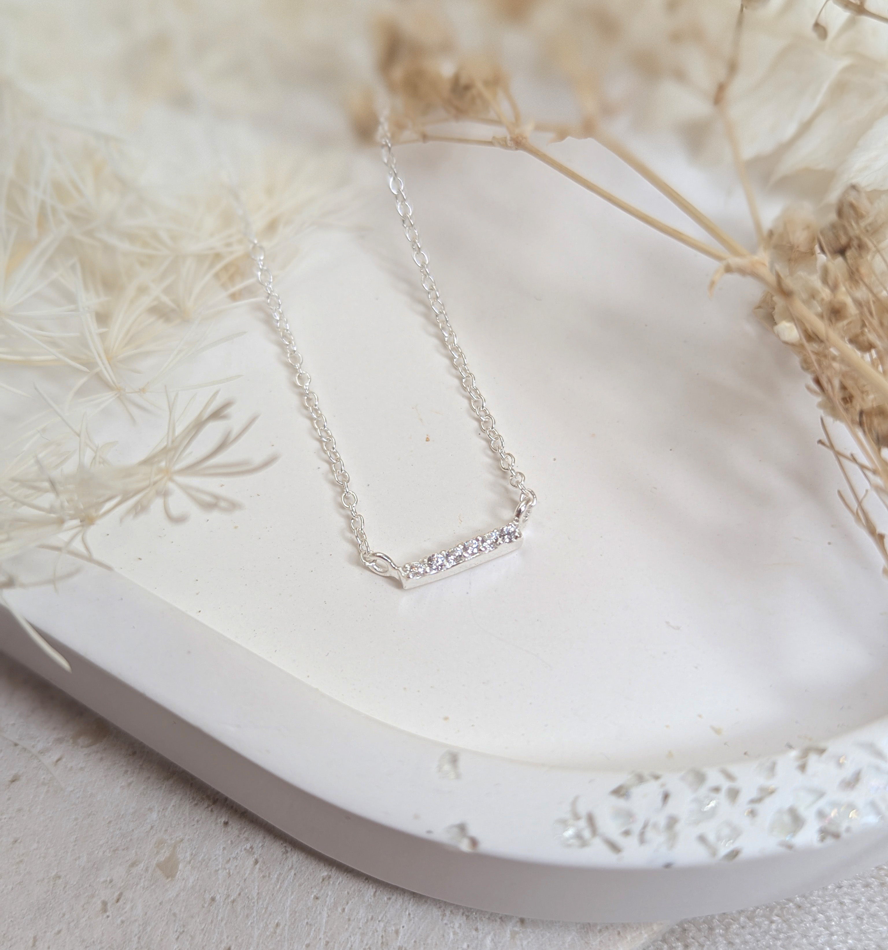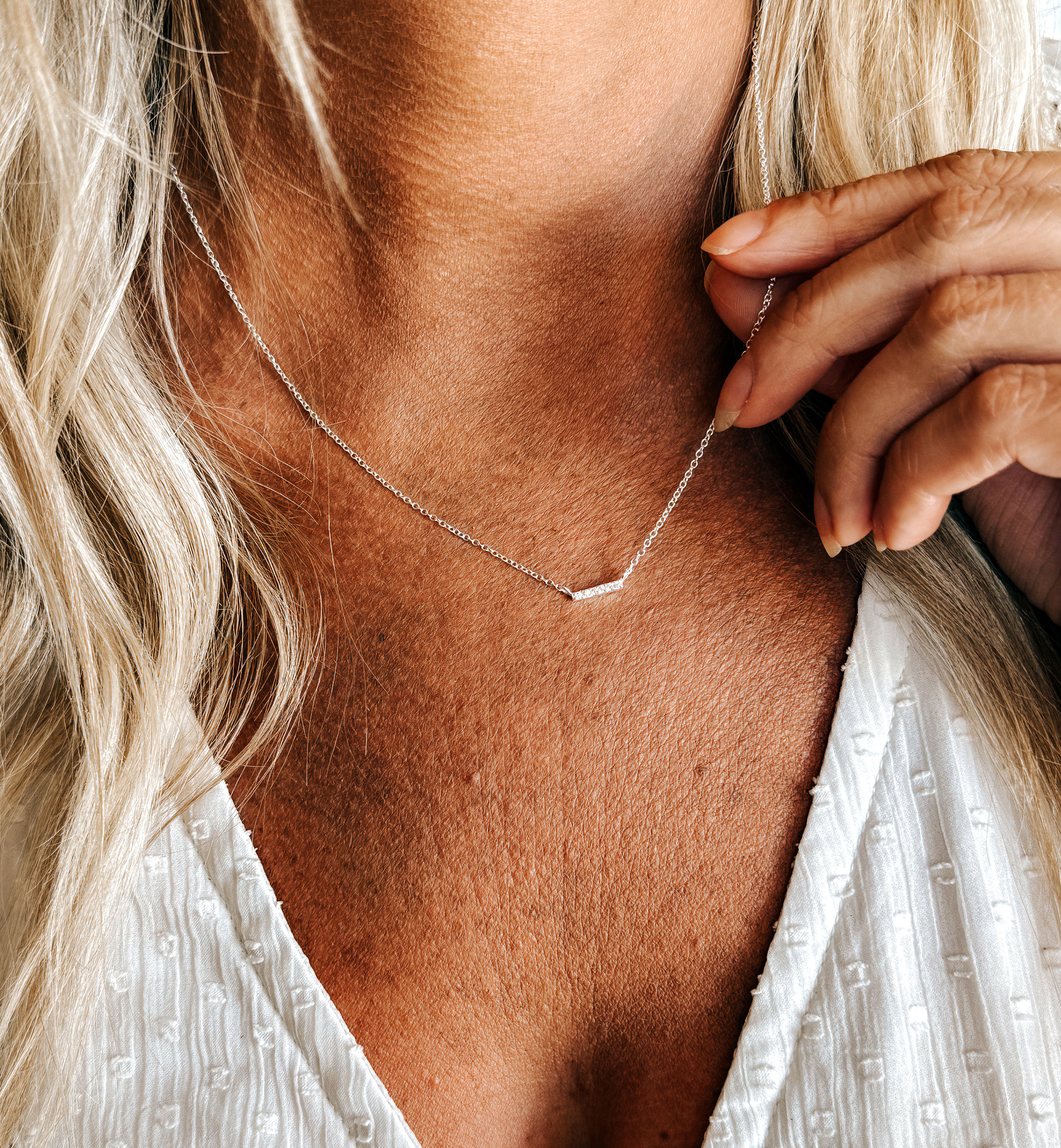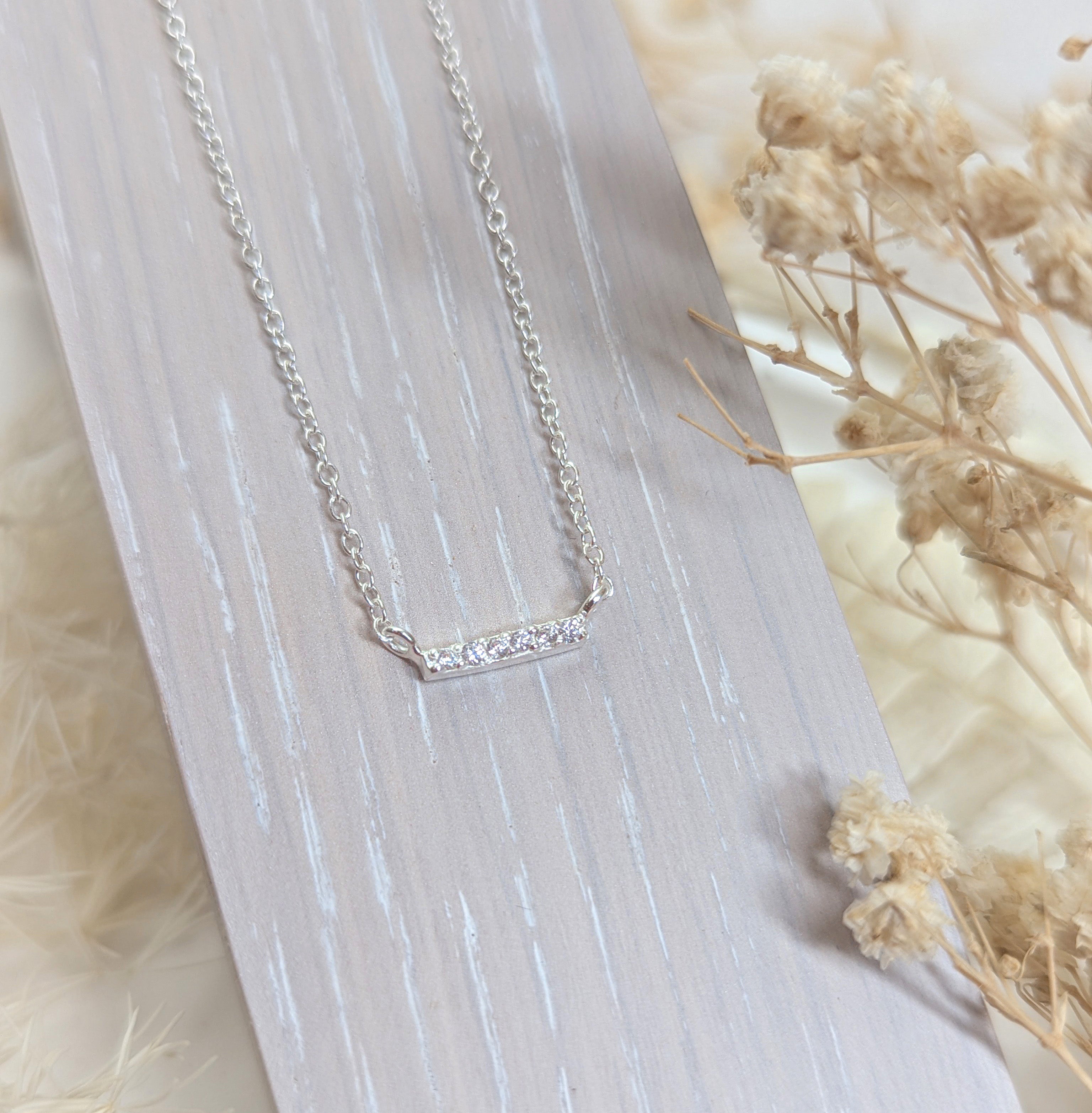 This dainty CZ bar necklace adds an effortless touch of sparkly elegance to any look! ♥ This beautiful sterling silver diamond bar necklace will be your new favorite go-to piece to add to any look! Whether dressing it up for a night out, or wearing it out for coffee, this is the perfect necklace for everyday wear and every occasion. This dainty bar necklace also makes the perfect layering necklace to pair with all your other favorite pieces! The tiny 1.5x10 mm CZ studded bar hangs on a delicate 17" sterling silver chain.